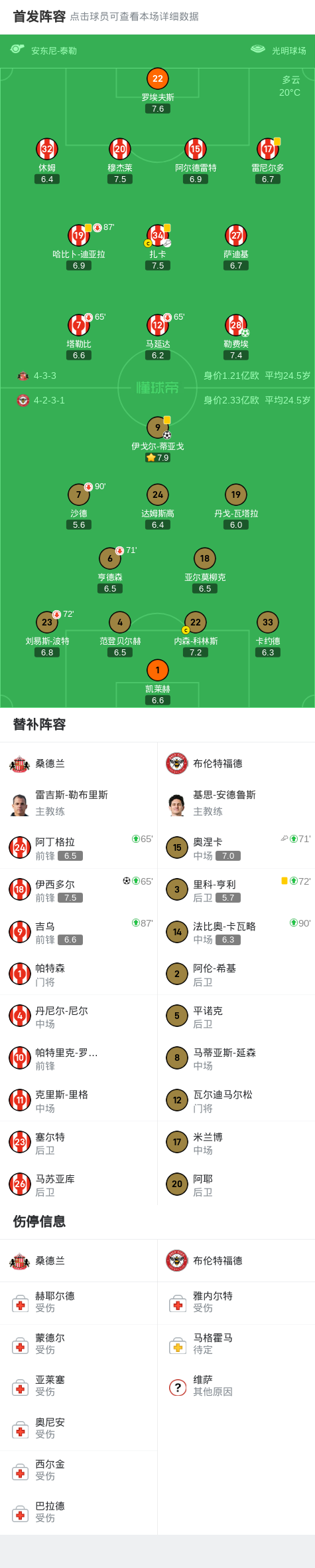 第77分钟,奥涅卡送出传中,蒂亚戈头球破门!桑德兰0-1布伦特福德